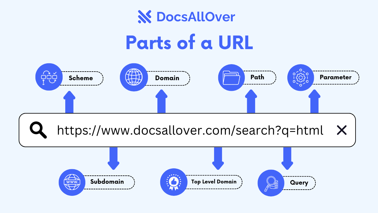 https://docsallover.com/blog/- This URL includes a path (/blog/web-programming/demystifying-urls-understanding-domain-names-paths/) indicating we want to access a specific blog post titled "Demystifying URLs: Understanding Domain Names, Paths, and Parameters" within the DocsAllOver website. - Search Results: https://docsallover.com/search?q=html - Here, we have a URL with parameters. The domain name is